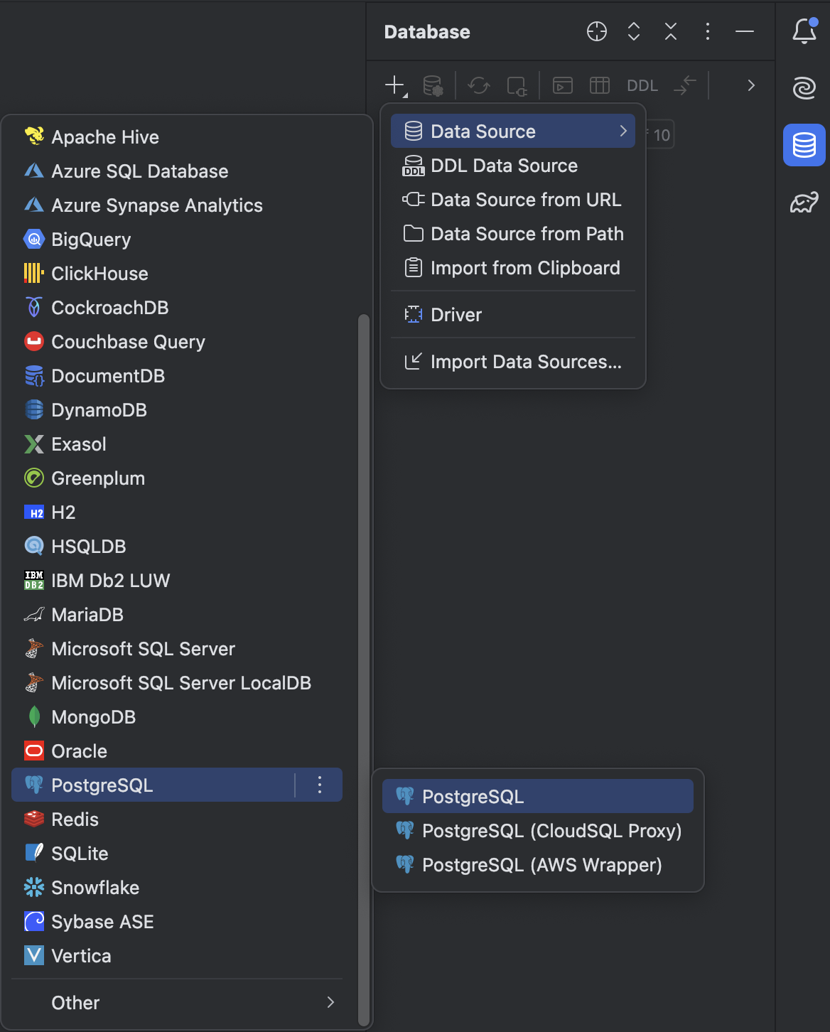 인텔리제이 오른쪽 Database 클릭 -> '+' 버튼 클릭 -> Data Source -> PostgreSQL 클릭