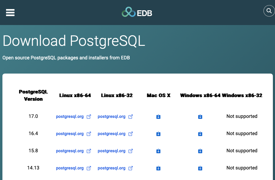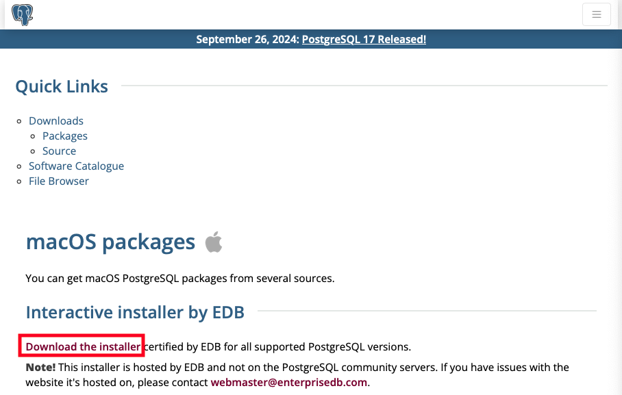 macOS packages You can get macOS PostgreSQL packages from several sources. Interactive installer by EDB Download the installer certified by EDB for all supported PostgreSQL versions. Note! This installer is hosted by EDB and not on the PostgreSQL community