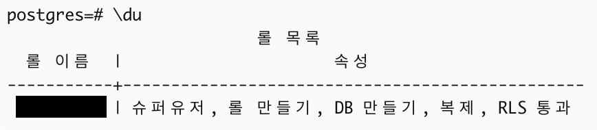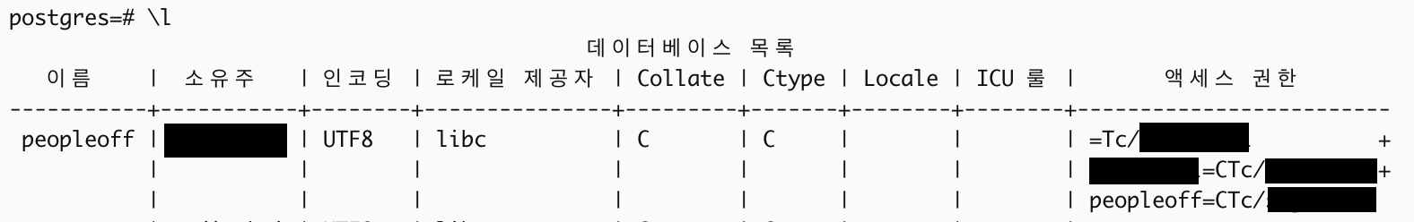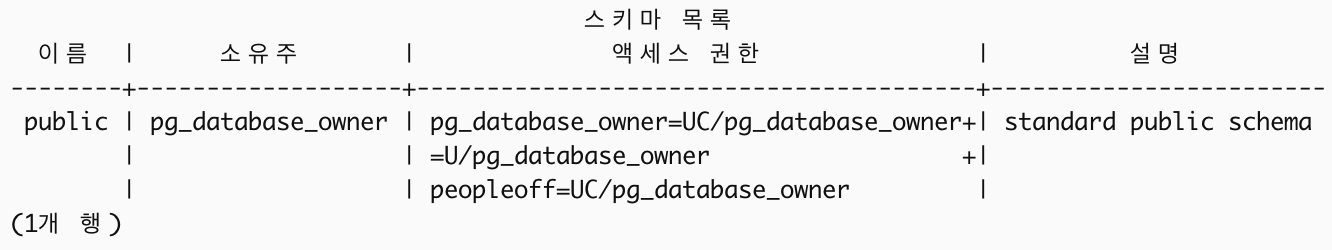 ** PostgreSQL에서 스키마는 특정 데이터베이스 내에서만 유효하므로 권한 부여 시, 꼭 해당 데이터베이스에 접속해 있는지 확인!
